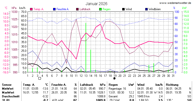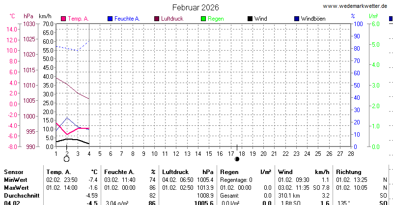 | Die dargestellten Werte repräsentieren die Daten des aktuellen Tages! Der Luftdruck ist auf Meereshöhe bezogen! |